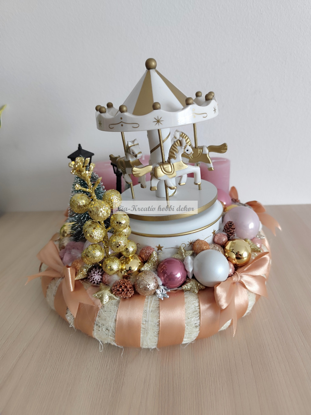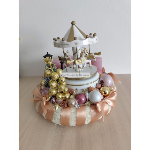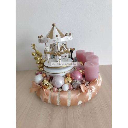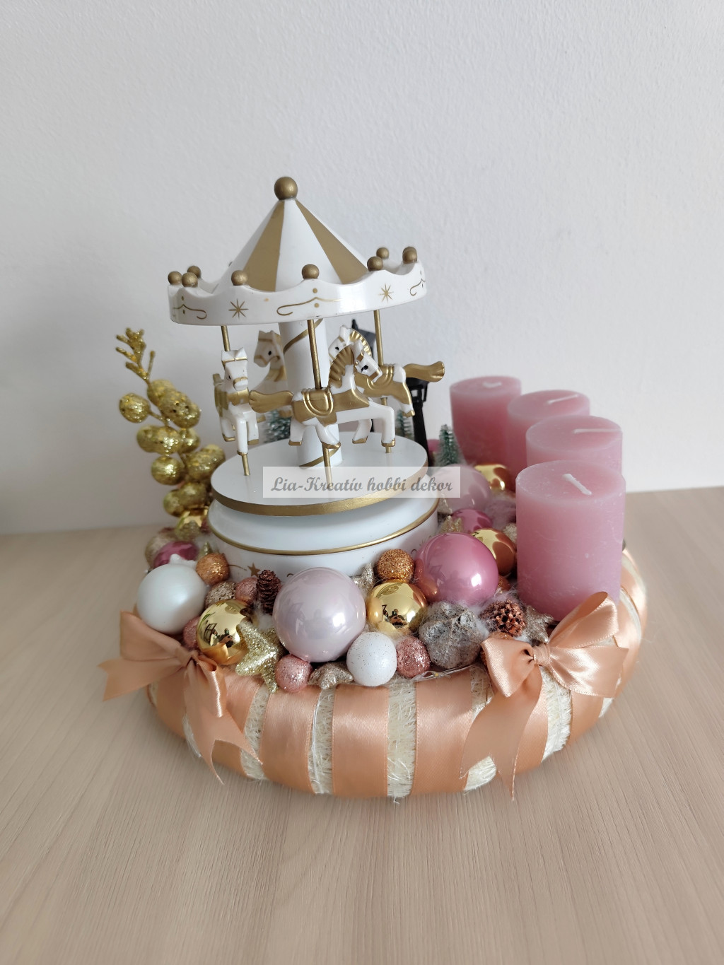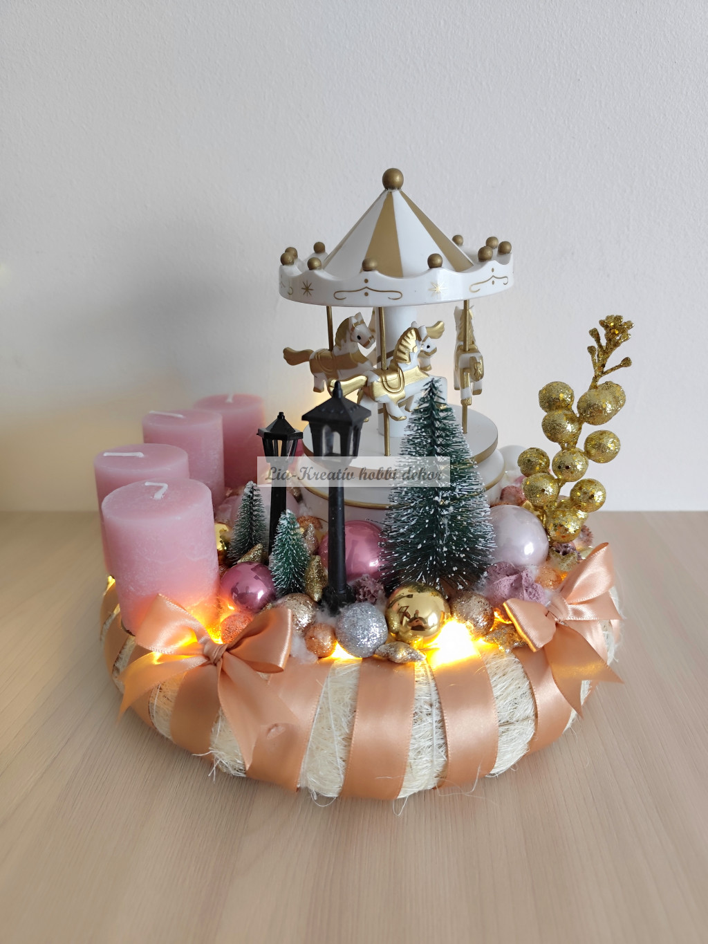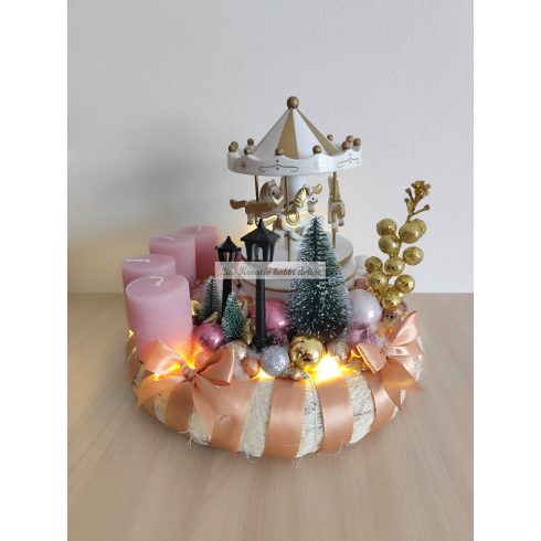 25 cm alapra kèszült rózsaszín-arany színvilágú adventi koszorú elemes led világítással amely 3 módon tud világítani